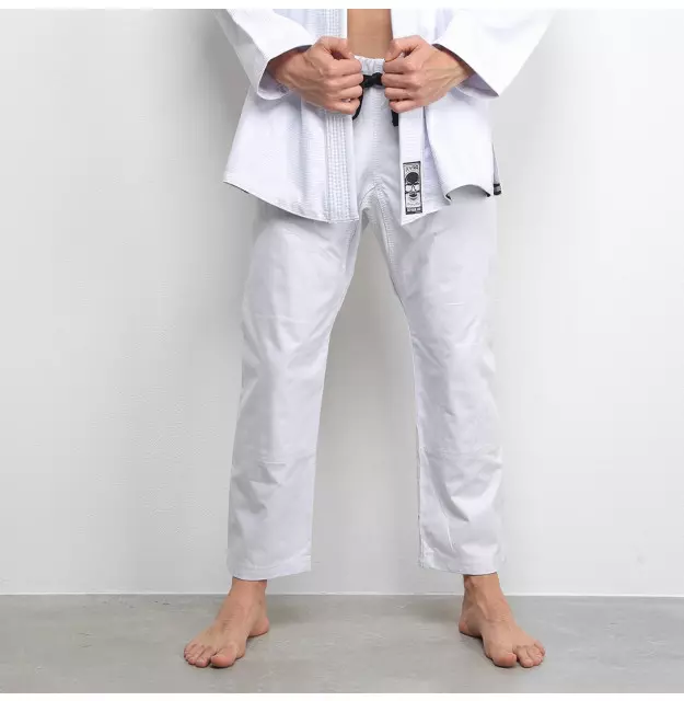 Calça (Shita-baki) em tecido de brim, duplo tecido de reforço na altura dos joelhos, regulagem através de cordão tipo fita plana com 2cm de largura e a mesma cor contrastante, e diferencial do cavalo em tecido trançado, que também favorece na estratégia de luta.