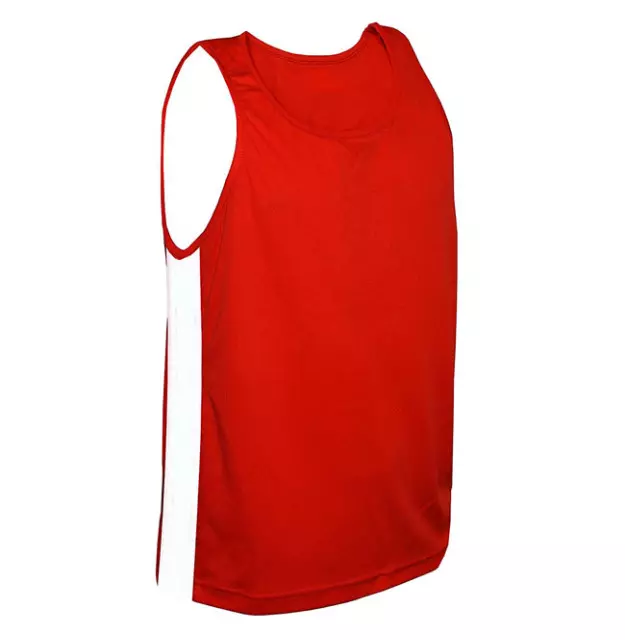 Camisa Regata Boxe Branca e Vermelha, fabricada em Poliéster e elastano, toque suave, secagem rápida.