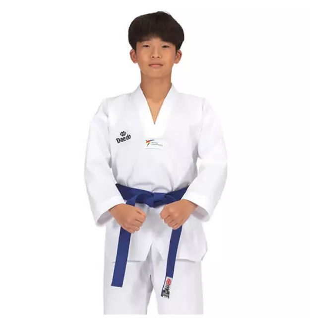 Dobok de excelente qualidade e acabamentos, composto por um casaco de gola branca sem letras nas costas e uma calça elástica, confortável e leve.