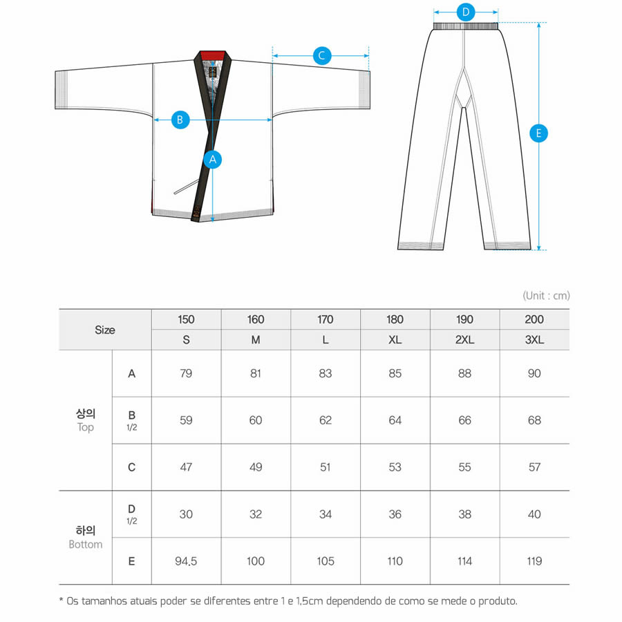 É extremamente importante que você verifique abaixo as informações sobre o tamanho do dobok para que você faça a escolha correta.