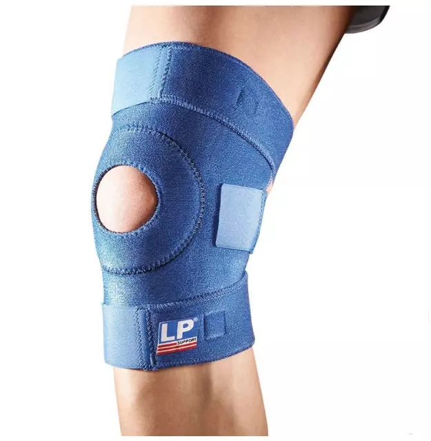 O design do fecho de gancho e laço se encaixa na maioria dos tamanhos de joelho. A abertura alivia a pressão na patela.
