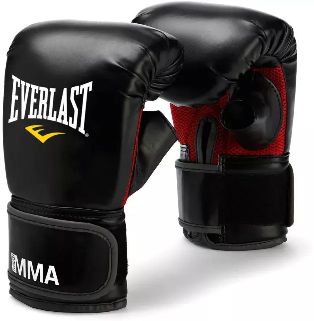 Luva Bate Saco Everlast MMA preta, confeccionada em PU de alta resistência, com enchimento triplo (soco frontal, dorso e pulso).