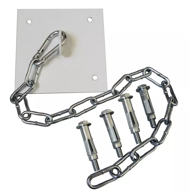 Acompanha 4 buchas de aço 10 mm e um gancho com corrente de 500 mm de comprimento. Cada bucha suporta 1000 kg.